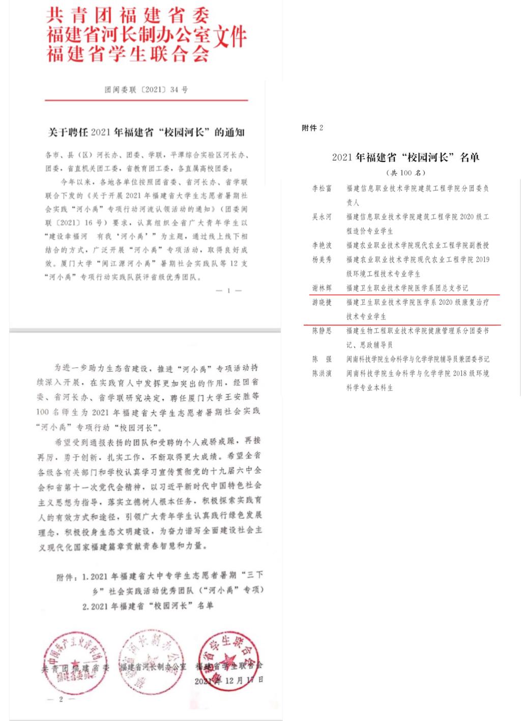 此外,共青團(tuán)福建省委、福建省河長(zhǎng)制辦公室、福建省學(xué)生聯(lián)合會(huì)下發(fā)《關(guān)于聘任2021年福建省“校園河長(zhǎng)”的通知》,我校謝林輝老師、游曉捷同學(xué)被聘為福建省“校園河長(zhǎng)”。