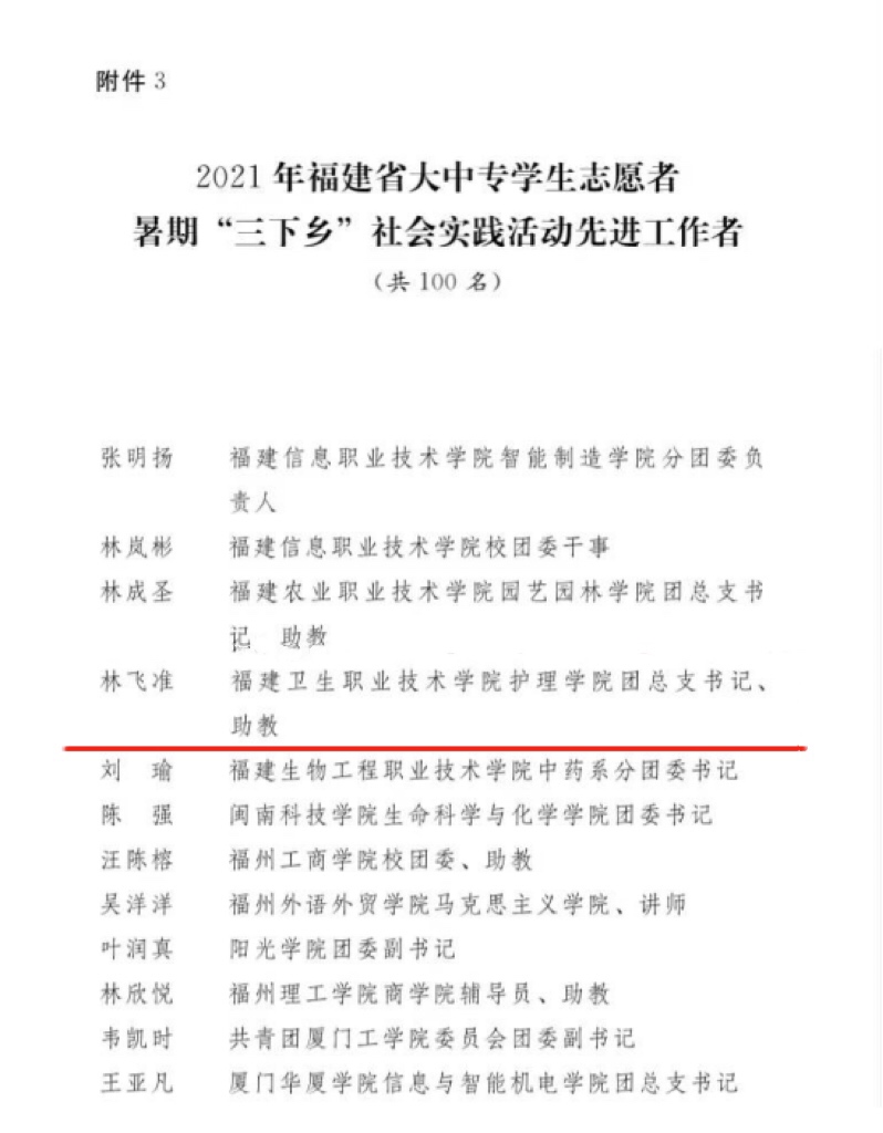近日,中共福建省委宣傳部、中共福建省委文明辦、中共福建省委教育工委、福建省河長(zhǎng)制辦公室、共青團(tuán)福建省委、福建省學(xué)生聯(lián)合會(huì)聯(lián)合下發(fā)《關(guān)于2021年福建省大中專學(xué)生志愿者暑期“三下鄉(xiāng)”社會(huì)實(shí)踐活動(dòng)優(yōu)秀集體和個(gè)人的通報(bào)》,我校被評(píng)為2021年福建省大中專學(xué)生志愿者暑期“三下鄉(xiāng)”社會(huì)實(shí)踐活動(dòng)先進(jìn)單位,這已是我校連續(xù)五年榮獲此項(xiàng)榮譽(yù)。“遇踐青春”社會(huì)實(shí)踐隊(duì)被評(píng)為福建省暑期“三下鄉(xiāng)”社會(huì)實(shí)踐活動(dòng)優(yōu)秀團(tuán)隊(duì),林飛準(zhǔn)老師獲福建省暑期“三下鄉(xiāng)”社會(huì)實(shí)踐活動(dòng)“先進(jìn)工作者”稱號(hào),阮月新同學(xué)獲福建省暑期“三下鄉(xiāng)”社會(huì)實(shí)踐活動(dòng)“先進(jìn)個(gè)人”稱號(hào)。