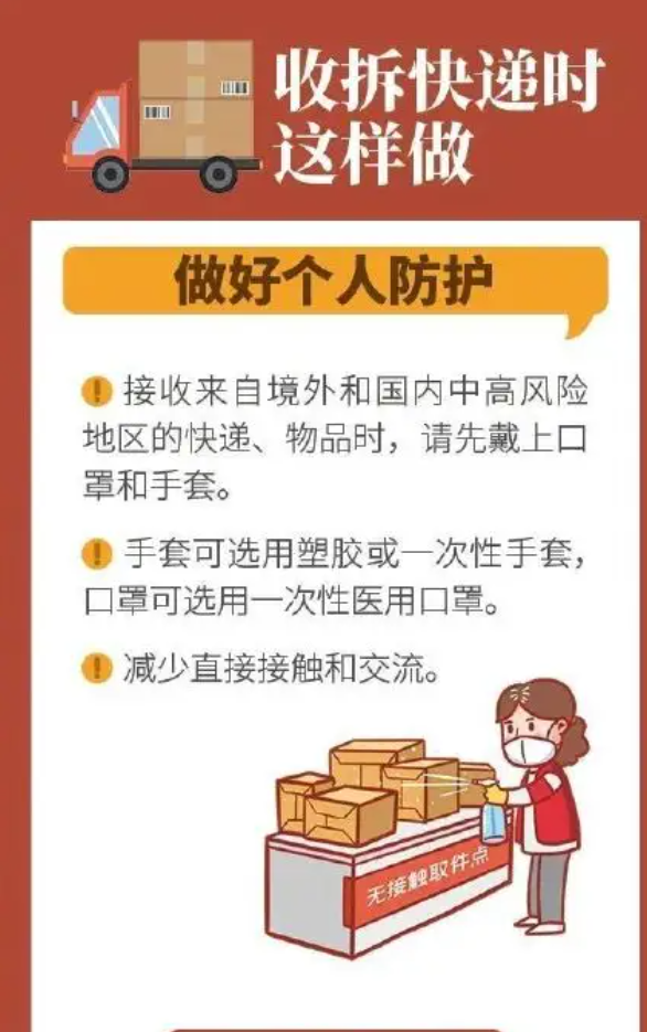 減少不必要網(wǎng)購(gòu),特別是不從中高風(fēng)險(xiǎn)區(qū)與國(guó)(境)外購(gòu)物。在接收快遞時(shí),應(yīng)全程佩戴口罩,建議先對(duì)外包裝進(jìn)行消毒,或者放置在通風(fēng)有陽(yáng)光處?kù)o置一段時(shí)間后再開(kāi)包使用,拆包后的垃圾應(yīng)按垃圾分類處理。處理完畢后,清洗消毒雙手。如接收到涉疫快遞,應(yīng)主動(dòng)報(bào)告輔導(dǎo)員,并配合排查工作。