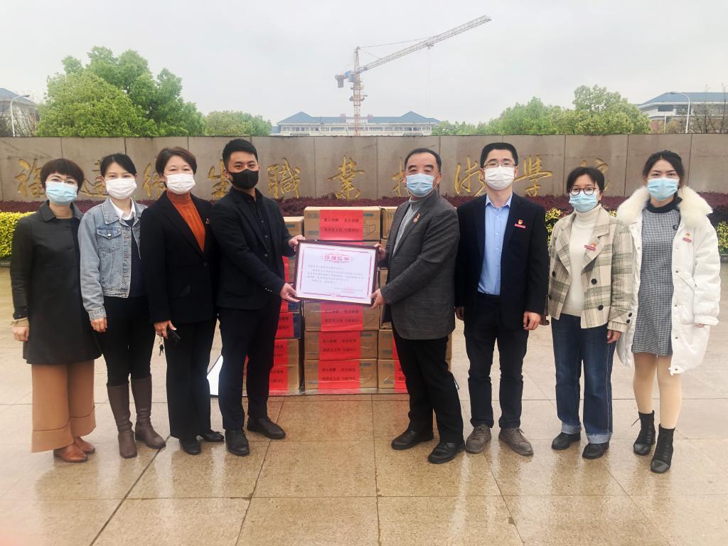 游鋒代表我校接受物資捐贈(zèng)并向企業(yè)頒發(fā)捐贈(zèng)證書,對(duì)宜又佳公司助力我校疫情防控工作表達(dá)感謝,強(qiáng)調(diào)將把此次捐贈(zèng)的物資用于師生的日常防護(hù)。