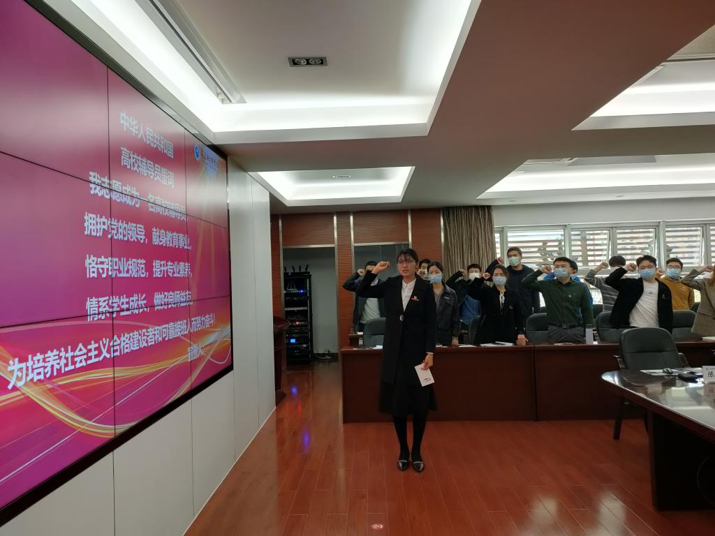 輔導(dǎo)員們平凡而充實(shí)的每一天是最堅(jiān)實(shí)的守候。會(huì)上,黃銘珊和陳俊穎為院系輔導(dǎo)員代表送上了鮮花與感恩卡,表達(dá)了學(xué)校和學(xué)生管理部門(mén)對(duì)這支隊(duì)伍的感謝和關(guān)懷?!拔抑驹赋蔀橐幻咝]o導(dǎo)員……為培養(yǎng)社會(huì)主義合格建設(shè)者和可靠接班人而努力奮斗!”高校輔導(dǎo)員誓詞在會(huì)場(chǎng)響徹,在輔導(dǎo)員尹德愛(ài)的領(lǐng)誓下,全體輔導(dǎo)員莊嚴(yán)起立,鏗鏘有力的宣誓聲表達(dá)了這支隊(duì)伍對(duì)思政育人事業(yè)的決心和責(zé)任心,在今后的職業(yè)生涯中,他們將初心依舊,砥礪前行。