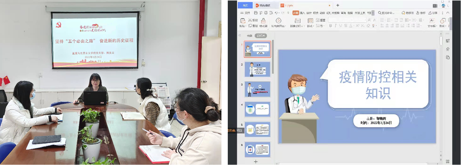 黨員教師們將偉大的抗疫精神融入黨性教育中,將疫情時(shí)刻的危機(jī)轉(zhuǎn)化為課程思政的契機(jī)。直屬馬克思主義學(xué)院黨支部書記熊美蘭為全體黨員教師開講《堅(jiān)持“五個(gè)必由之路”奮進(jìn)新的歷史征程》主題黨課,并通過課程集備,討論在課堂內(nèi)容中充分融入抗疫素材,將抗疫先進(jìn)事跡和理想信念教育有機(jī)融合,同時(shí)對學(xué)生做好心理疏導(dǎo)和正面引導(dǎo),鼓勵學(xué)生以積極的態(tài)度同心戰(zhàn)“疫”。藥學(xué)院第一黨支部結(jié)合疫情防控工作組織線上黨日活動,開展“抗擊疫情 奉獻(xiàn)有我”防疫宣講,并聯(lián)合藥學(xué)院團(tuán)總支舉辦防疫知識競賽送香囊活動,通過活動引導(dǎo)學(xué)生樹立“從我做起,積極防疫”的意識,肩負(fù)起疫情防控的使命。
