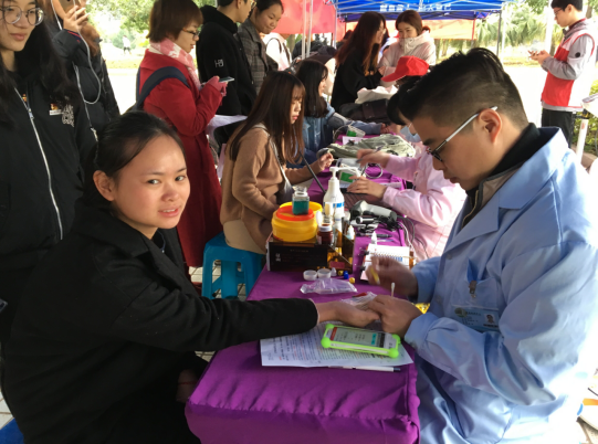 寒冷的天氣并未阻擋大家的獻(xiàn)血熱情,活動(dòng)現(xiàn)場(chǎng)不乏獻(xiàn)血多次的同學(xué)們,為自己的行動(dòng)能挽救更多的生命感到高興。志愿者們也是一道亮麗的風(fēng)景線,他們臉上洋溢著笑容,熱心地為大家服務(wù)。有的一邊發(fā)放宣傳單,一邊為來(lái)往的師生宣講無(wú)償獻(xiàn)血知識(shí),有的耐心指導(dǎo)獻(xiàn)血者填寫(xiě)表格,為了對(duì)獻(xiàn)血者和將來(lái)的受助者負(fù)責(zé),現(xiàn)場(chǎng)還按照有關(guān)規(guī)定,為獻(xiàn)血者進(jìn)行嚴(yán)謹(jǐn)?shù)暮Y查!