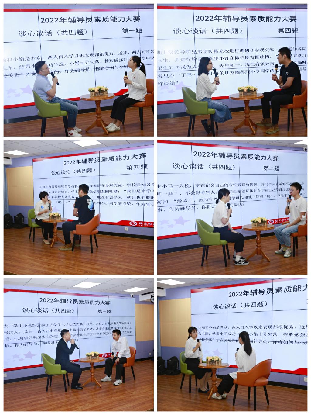 本次決賽參照全省輔導(dǎo)員素質(zhì)能力大賽最新賽制舉行,分為案例研討、談心談話兩個(gè)環(huán)節(jié)。