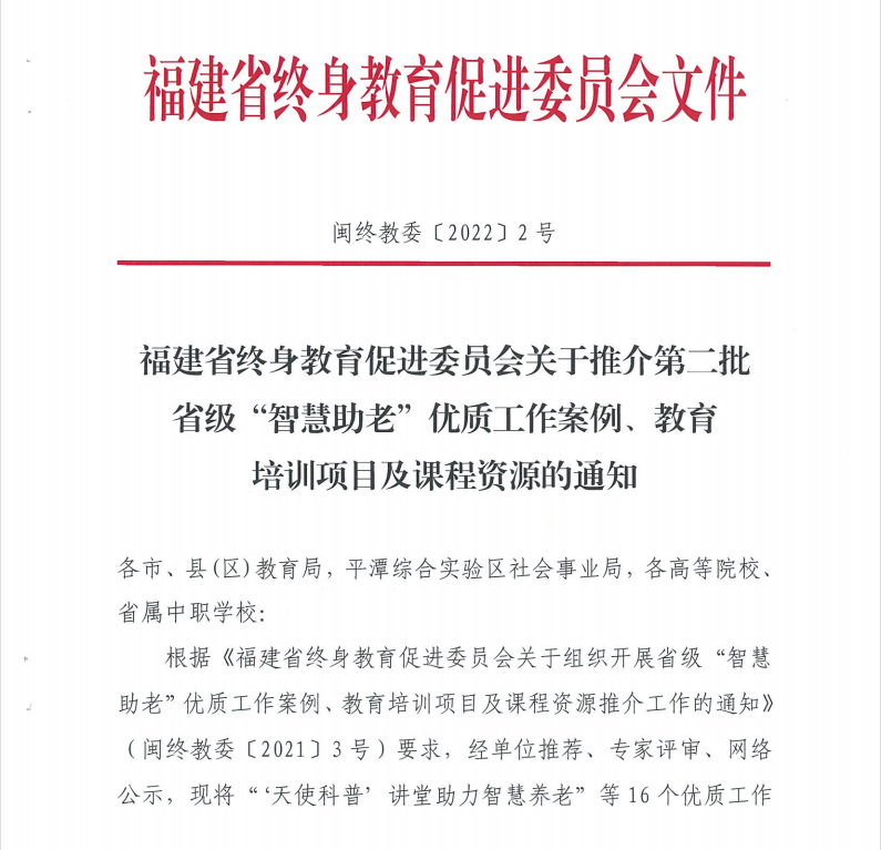 根據(jù)《福建省終身教育促進(jìn)委員會(huì)關(guān)于推介第二批省級(jí)“智慧助老”優(yōu)質(zhì)工作案例、教育培訓(xùn)項(xiàng)目及課程資源的通知》,我校醫(yī)學(xué)院林國(guó)威老師負(fù)責(zé)的“‘天使科普’講堂助力智慧養(yǎng)老”入選優(yōu)質(zhì)工作案例;醫(yī)學(xué)院林玉瓊老師負(fù)責(zé)的“多科聯(lián)動(dòng)、搶在遺忘之前——失智癥的防治”入選優(yōu)質(zhì)課程資源。特此祝賀!