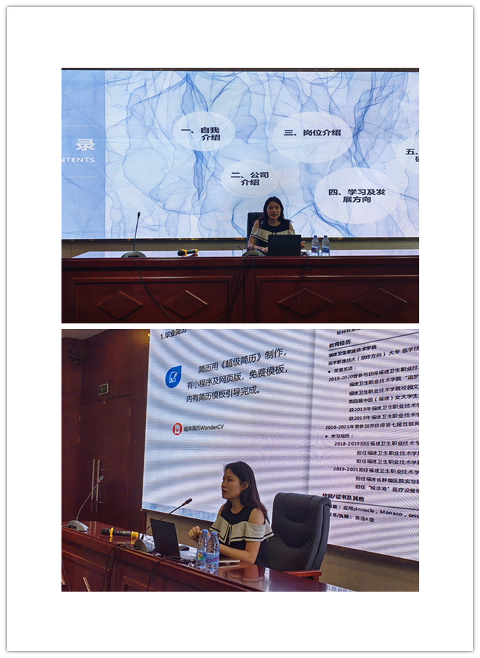 時值110周年校慶,9月9日下午,醫(yī)學(xué)技術(shù)系還特邀在校期間擔(dān)任18級影像303(放療班)班長、福建省腫瘤醫(yī)院實習(xí)隊副隊長 、創(chuàng)新創(chuàng)業(yè)“械診港”醫(yī)療設(shè)備維修平臺項目負(fù)責(zé)人,現(xiàn)就職于福建國藥器械有限公司擔(dān)任副董事長助理的優(yōu)秀校友林詩婷來校參與入學(xué)教育。她以現(xiàn)就職公司情況和招聘崗位需求為例,拓展同學(xué)們對專業(yè)行業(yè)的認(rèn)知,鼓勵同學(xué)們跟上時代腳步,打破固有思維壁壘,樹立就業(yè)多元化交叉思維。林詩婷還分享交流了自身在校的學(xué)習(xí)、實習(xí)、求職感悟及職場工作經(jīng)驗,勉勵新入學(xué)的學(xué)弟學(xué)妹們珍惜在校園的學(xué)習(xí)機(jī)會,積極利用一切校內(nèi)外資源提升專業(yè)技能和擴(kuò)展興趣愛好,豐富業(yè)余生活,為將來走出校園進(jìn)入社會打下堅實牢固的基礎(chǔ)。