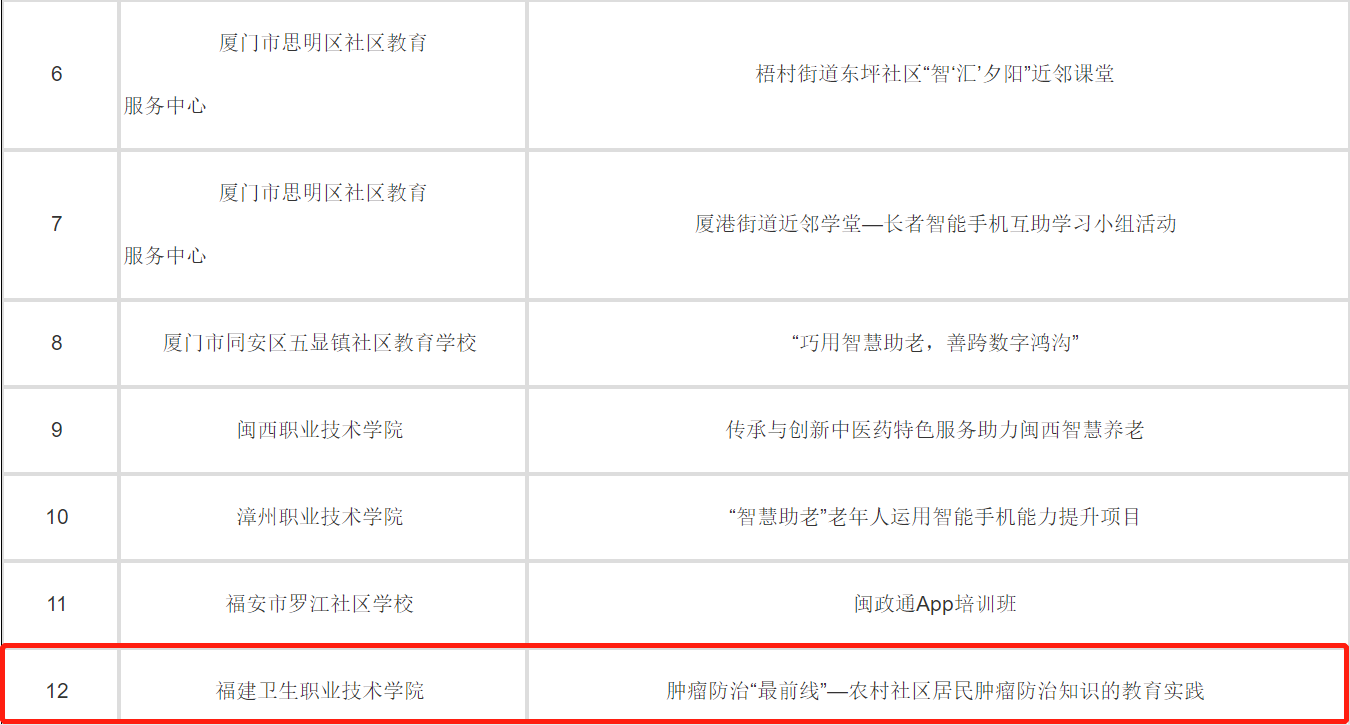 近日,福建省終身教育促進委員會公布第三批省級“智慧助老”優(yōu)質(zhì)工作案例、教育培訓(xùn)項目及課程資源推介名單,我校護理學(xué)院連劍娟老師負責(zé)的“腫瘤防治‘最前線’——農(nóng)村社區(qū)居民腫瘤防治知識的教育實踐 ”入選優(yōu)質(zhì)工作案例。