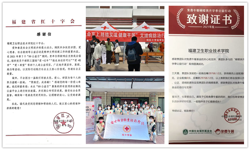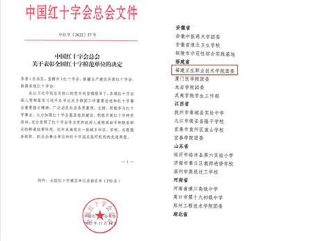 近日,中國紅十字會(huì)總會(huì)對在紅十字工作中表現(xiàn)突出、起到模范帶頭作用的單位予以表彰,福建衛(wèi)生職業(yè)技術(shù)學(xué)院團(tuán)委被授予“全國紅十字模范單位”稱號,這是對我校紅十字工作的肯定,也是對我校踐行 “崇健臻善” 校風(fēng)取得成效的鼓舞和鞭策。