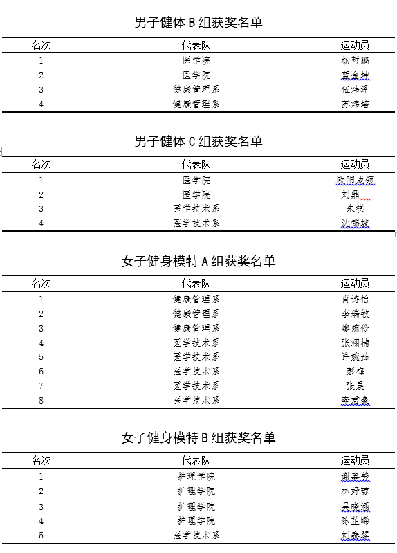 經(jīng)過激烈角逐,醫(yī)學(xué)技術(shù)系1隊(duì)與護(hù)理學(xué)院1隊(duì)并列雙人花球冠軍,醫(yī)學(xué)技術(shù)系1隊(duì)還獲得集體花球示范套路冠軍;健康管理系黃思翔獲得男子健體A組冠軍,醫(yī)學(xué)院楊哲鵬獲得男子健體B組冠軍,醫(yī)學(xué)院歐陽成領(lǐng)獲得男子健體C組冠軍,健康管理系肖詩怡獲得女子健身模特A組冠軍,護(hù)理學(xué)院謝嘉美獲得女子健身模特B組冠軍;健康管理系獲得團(tuán)體比賽一等獎(jiǎng)。
