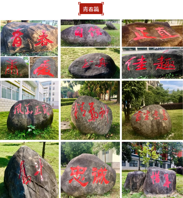 傳統(tǒng)與現(xiàn)代并存,書(shū)法與石刻融合,賦予天然卵石文化內(nèi)涵和藝術(shù)生命,提升景觀建設(shè)文化藝術(shù)品位,營(yíng)造環(huán)境育人良好氛圍,也是對(duì)中華優(yōu)秀文化的傳承與弘揚(yáng)。