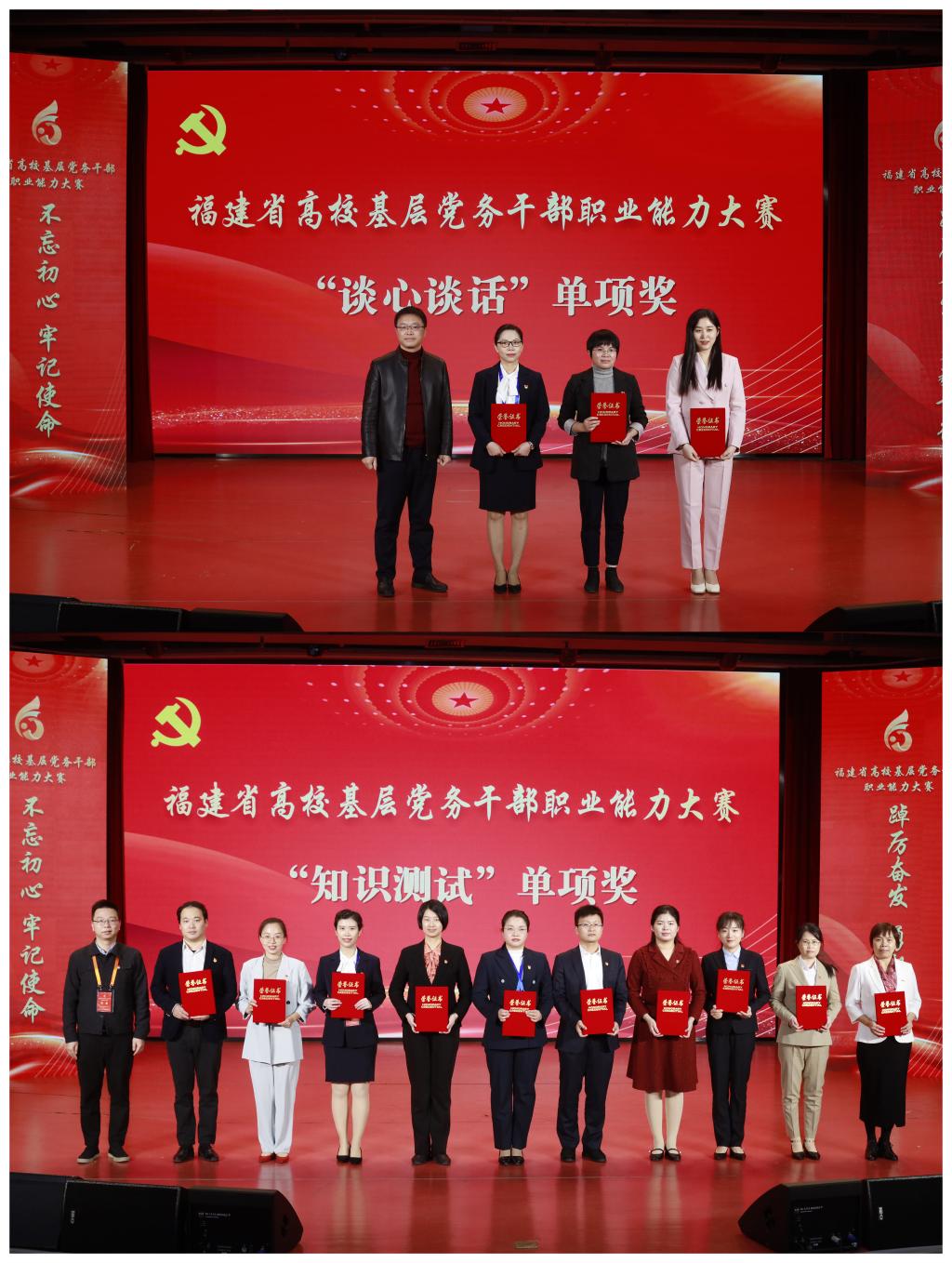 全省高?;鶎狱h務(wù)干部職業(yè)能力大賽分三個階段,第一階段設(shè)“知識測試”“主題黨日策劃”兩個賽項;第二階段設(shè)“微黨課”賽項;第三階段設(shè)“談心談話”賽項。我校在三個階段比賽中均表現(xiàn)優(yōu)異,其中,黃玲云老師榮獲“談心談話”賽項全省第一名、“知識測試”賽項全省第二名 ,劉丹丹老師榮獲“微黨課”賽項全省第四名,團隊總成績最終榮獲高職組全省第二名。