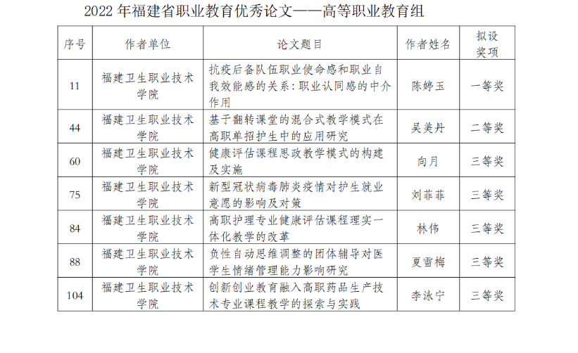 近日,在福建省職業(yè)技術(shù)教育中心組織的2022年福建省職業(yè)教育優(yōu)秀論文征集評選活動中,我校有7篇論文獲獎。陳婷玉老師的《抗疫后備隊(duì)伍職業(yè)使命感和職業(yè)自我效能感的關(guān)系:職業(yè)認(rèn)同感的中介作用》榮獲一等獎;吳美丹老師的《基于翻轉(zhuǎn)課堂的混合式教學(xué)模式在高職單招護(hù)生中的應(yīng)用研究》榮獲二等獎;劉菲菲老師的《新型冠狀病毒肺炎疫情對護(hù)生就業(yè)意愿的影響及對策》、林偉老師的《高職護(hù)理專業(yè)健康評估課程理實(shí)一體化教學(xué)的改革》、向月老師的《健康評估課程思政教學(xué)模式的構(gòu)建及實(shí)施》、夏雪梅老師的《負(fù)性自動思維調(diào)整的團(tuán)體輔導(dǎo)對醫(yī)學(xué)生情緒管理能力影響研究》、李泳寧老師的《創(chuàng)新創(chuàng)業(yè)教育融入高職藥品生產(chǎn)技術(shù)專業(yè)課程教學(xué)的探索與實(shí)踐》榮獲三等獎。