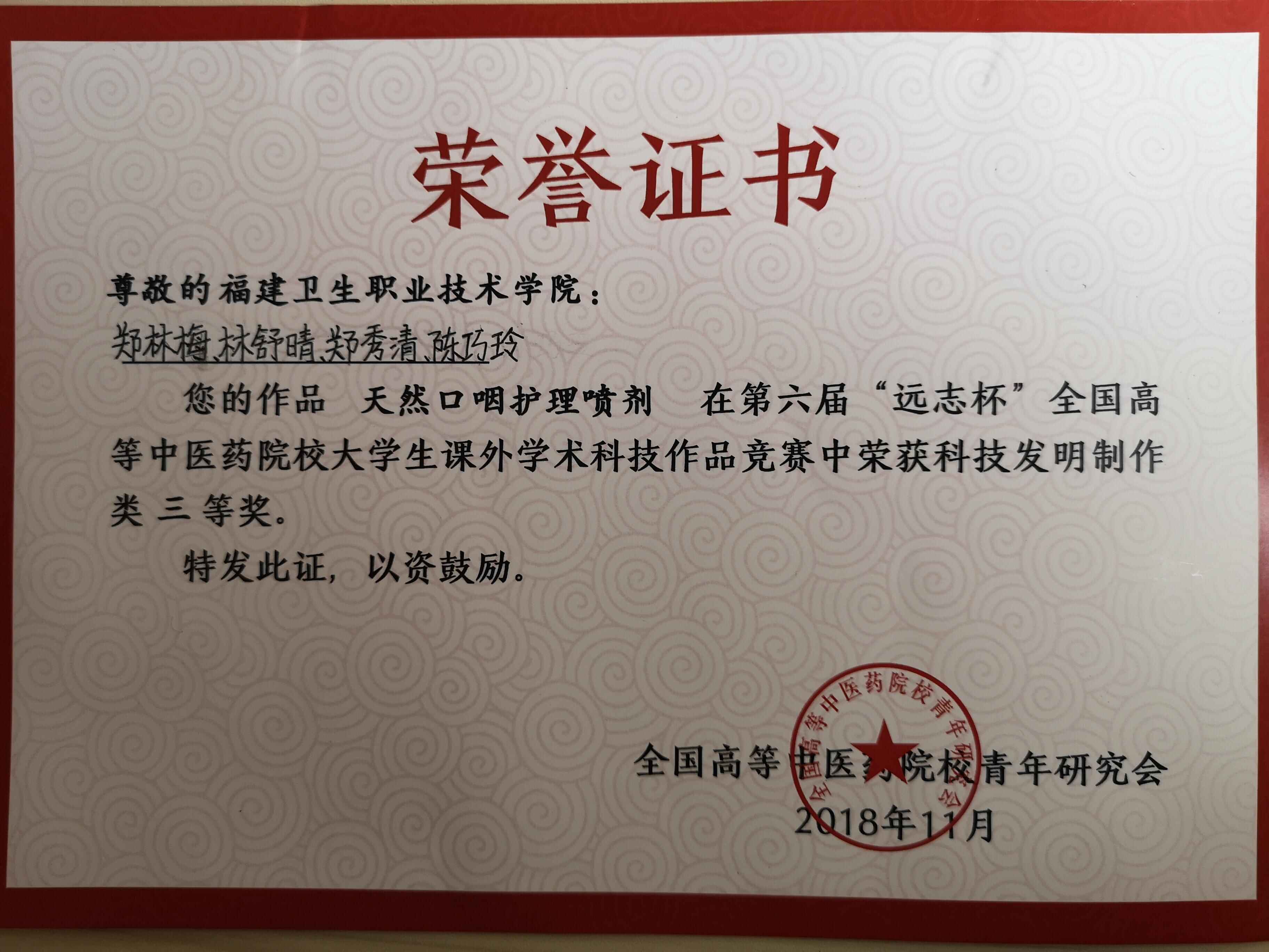 11月26日,藥學系《天然口咽護理噴劑》項目在第六屆“遠志杯”全國高等中醫(yī)藥院校大學生課外學術科技作品競賽中榮獲科技發(fā)明制作類三等獎。該項目負責人為16藥學304班鄭林梅同學,指導老師為藥學系黃仁杰教授。