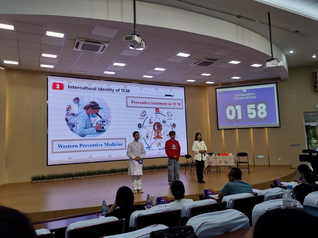 我校代表隊的三位選手結合中醫(yī)藥跨文化傳播開發(fā)案例,合理運用跨文化交際相關概念和理論進行分析,并對案例中出現(xiàn)的跨文化沖突提出了切實可行的解決方案。三位選手分工得當,用自信流利的英語進行表演和辨析,展現(xiàn)了優(yōu)秀的英語能力、思辨能力和團隊合作能力,圓滿完成比賽任務。