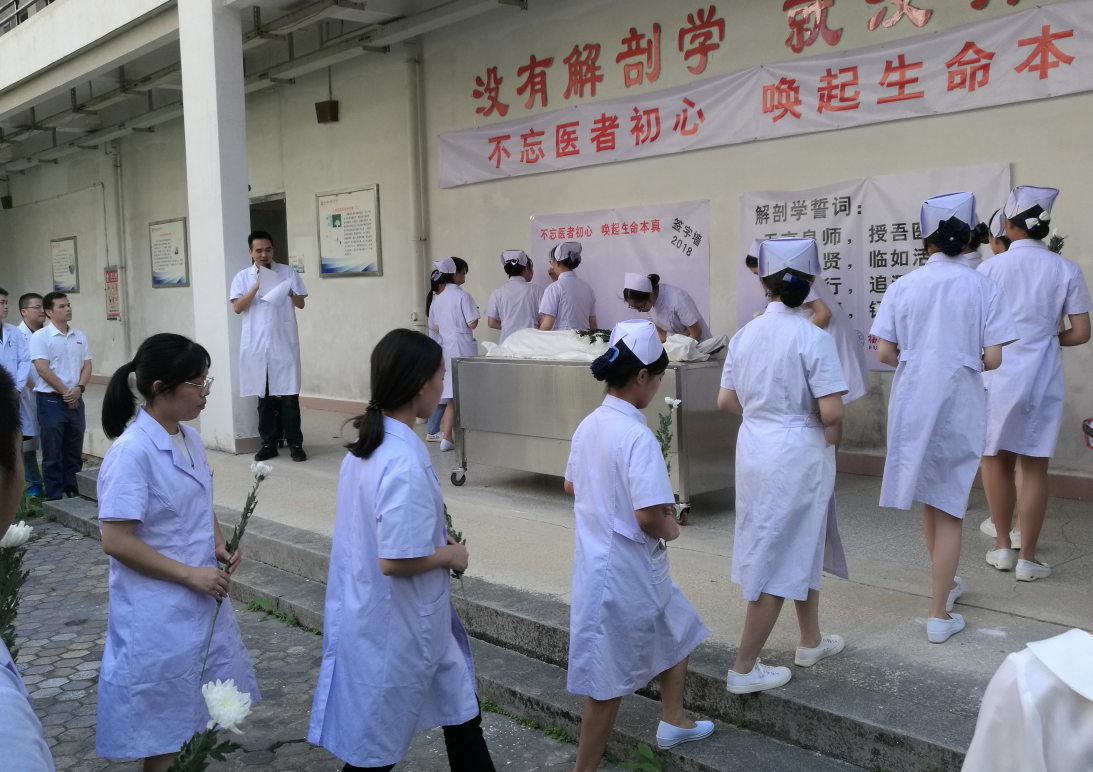 活動從生命教育的宣講開始,主持人陳戴和老師深情講述目前遺體捐贈的現(xiàn)狀,以及人體標(biāo)本在醫(yī)學(xué)教育中的重要作用,從而激發(fā)醫(yī)學(xué)生對遺體捐贈者及家屬的感激之情。隨后,葉榕老師帶領(lǐng)全體醫(yī)學(xué)生代表進行解剖學(xué)誓詞宣誓,宣誓莊嚴(yán)而又神圣,“無言良師,授吾醫(yī)理;敬若先賢,臨如活體;謹言躬行,追深辨細;德彰術(shù)精,錘成大醫(yī)”,響亮的宣誓聲在基礎(chǔ)部回蕩。接著,大家向大體老師深深鞠躬,敬獻菊花,并在活動簽字墻簽字留念。一朵朵潔白的菊花,表達了大家無盡的感恩與尊敬之情。一片片綠葉,正襯托出大體老師無私奉獻的大愛,永遠在醫(yī)學(xué)生的心中煥發(fā)著生命的活力。