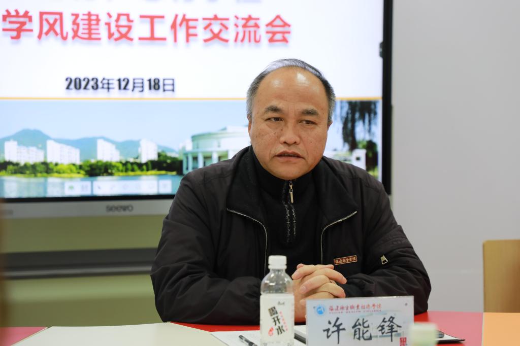 許能鋒仔細(xì)聽取并詳細(xì)記錄了與會師生代表的發(fā)言,就大家提出的意見和建議作出回應(yīng),肯定了與會成員們提出的真切建議和需求。他結(jié)合實際案例強調(diào)學(xué)生學(xué)風(fēng)建設(shè)的定位及重要性,并指出學(xué)生學(xué)風(fēng)是事關(guān)學(xué)校發(fā)展的一個重要系統(tǒng)工程,希望學(xué)校各職能部門要以此次座談會為契機,協(xié)同合力抓學(xué)風(fēng);教師群體要落實課堂第一責(zé)任人的義務(wù),因材施教育學(xué)風(fēng);學(xué)生群體要潛心致學(xué),不斷進取爭學(xué)風(fēng)。