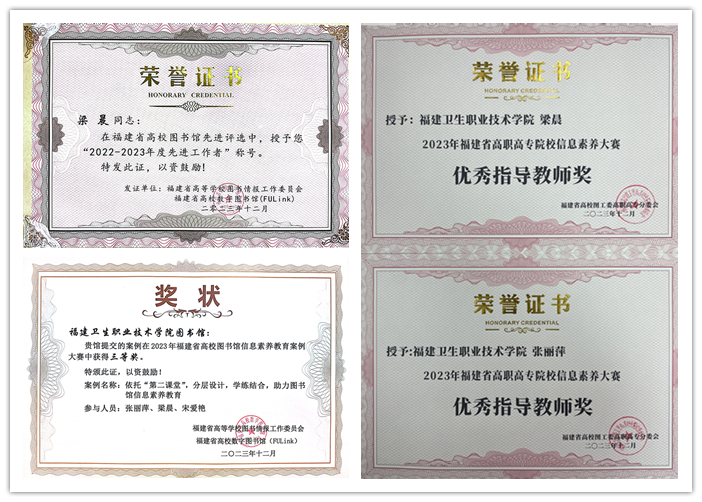 我校圖書館獲得福建省高校圖工委2022-2023年度先進集體榮譽稱號及2023年福建省高職高專院校信息素養(yǎng)大賽最佳組織獎,梁晨獲得福建省高校圖工委2022-2023年度先進工作者榮譽稱號,我校圖書館報送的案例《依托“第二課堂”,分層設計,學練結合,助力圖書館信息素養(yǎng)教育》獲得2023年福建省高校圖書館信息素養(yǎng)教育案例大賽三等獎,張麗萍獲得2023年福建省高職高專院校信息素養(yǎng)大賽先進工作者榮譽稱號,梁晨和張麗萍獲得2023年福建省高職高專院校信息素養(yǎng)大賽優(yōu)秀指導教師獎。