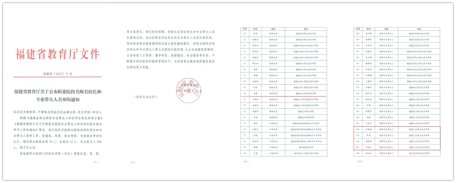 近日,福建省教育廳公布了職業(yè)院校名師名校長(zhǎng)和專(zhuān)業(yè)帶頭人名單。根據(jù)《福建省職業(yè)院校專(zhuān)業(yè)帶頭人和名師名校長(zhǎng)培養(yǎng)方案》《福建省教育廳關(guān)于開(kāi)展職業(yè)院校專(zhuān)業(yè)帶頭人和名師名校長(zhǎng)考評(píng)工作的通知》等文件精神,經(jīng)遴選、培養(yǎng)、結(jié)業(yè)考核、專(zhuān)家綜合考評(píng)和公示,我校教師洪霞確定為高職名師,李淼淼、李宏、龔海蓉、李泳寧確定為高職專(zhuān)業(yè)帶頭人。