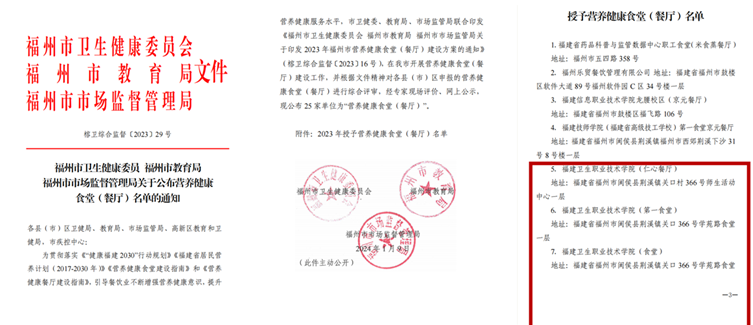 近日,福州市衛(wèi)健委、教育局、市場(chǎng)監(jiān)管局聯(lián)合公布了2023年福州市營(yíng)養(yǎng)健康食堂(餐廳)名單,經(jīng)申報(bào)、綜合評(píng)審、專家現(xiàn)場(chǎng)評(píng)價(jià)、網(wǎng)上公示,我校第一食堂、第二食堂(含教工食堂)、仁心餐廳被授予“營(yíng)養(yǎng)健康食堂(餐廳)”稱號(hào)。