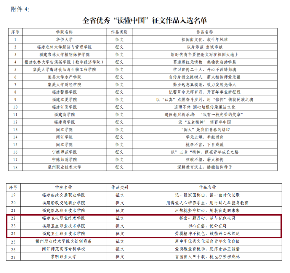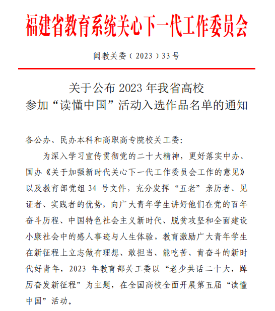 教育部關(guān)工委“讀懂中國”活動,至今已開展6年。我校根據(jù)教育部關(guān)工委及福建省教育系統(tǒng)關(guān)工委的工作部署,歷年來推薦報(bào)送的視頻及征文榮獲多項(xiàng)省級榮譽(yù),活動組織工作也受到上級單位的表揚(yáng)。下一步,我校將繼續(xù)以“讀懂中國”活動為契機(jī),進(jìn)一步凝聚“五老”力量,強(qiáng)化育人實(shí)效,為培養(yǎng)德智體美勞全面發(fā)展的社會主義健康事業(yè)接班人作出新的更大貢獻(xiàn),在新時(shí)代新征程上貢獻(xiàn)閩衛(wèi)院學(xué)子的青春力量。