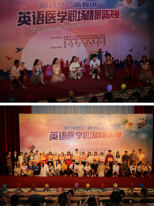 為踐行十九大,弘揚(yáng)醫(yī)德醫(yī)風(fēng),豐富校園文化生活,探索醫(yī)學(xué)英語教學(xué)新模式,6月12日,由學(xué)院黨委工作部、團(tuán)委、基礎(chǔ)部外語教研室聯(lián)合主辦的“職場(chǎng)夢(mèng)·青春語”英語醫(yī)學(xué)職場(chǎng)情景劇決賽在學(xué)術(shù)廳隆重舉行,我院黨委曾武祈書記、黨委林建團(tuán)副書記、紀(jì)委李美華書記、鄭翠紅副院長以及相關(guān)職能處室、系部領(lǐng)導(dǎo)蒞臨比賽現(xiàn)場(chǎng)。