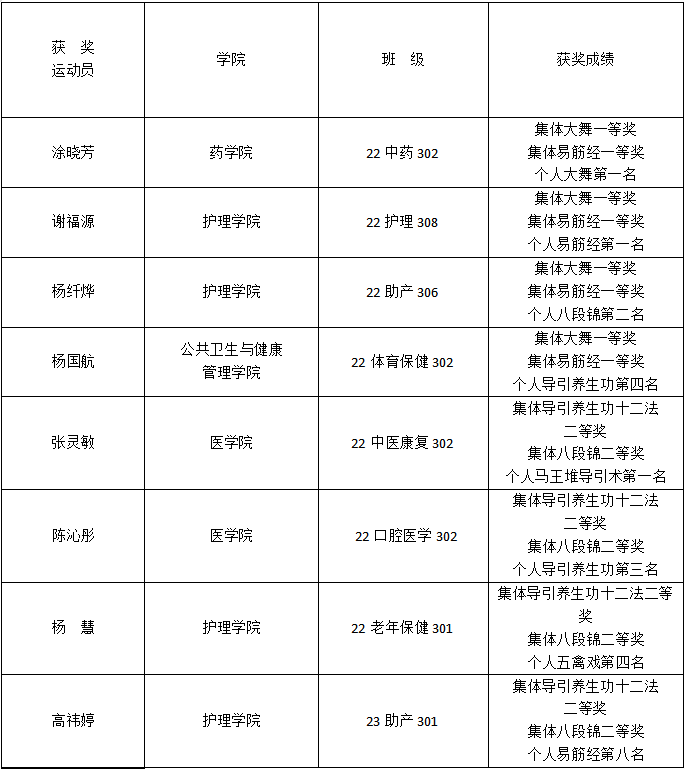 校健身氣功隊的8名隊員在體育部主任阮秋容,教練黃躍、林玉平、胡麗芳、唐圣的帶領(lǐng)下參賽。比賽中,他們以飽滿的熱情、充足的自信毫無保留地展現(xiàn)自己的實力和風(fēng)采,最終獲得4金、2銀、2銅,3項第四名、1項第八名的好成績,黃躍、林玉平兩位老師被賽會評選為“優(yōu)秀指導(dǎo)教師”。