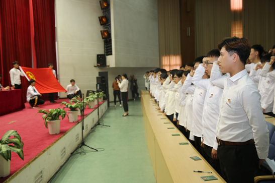 新團員入團儀式上,各系團總支書記、副書記為新團員代表佩戴團徽、頒發(fā)團員證。梅煊等115名新團員在院團委宋秋瓊老師帶領下,高舉右手,緊握拳頭,宣讀入團誓詞。在場的全體團員青年重溫入團誓詞。闕愛勇同學作為入團介紹人代表宣讀團員的義務和權利,張錚同學作為新團員代表發(fā)言。