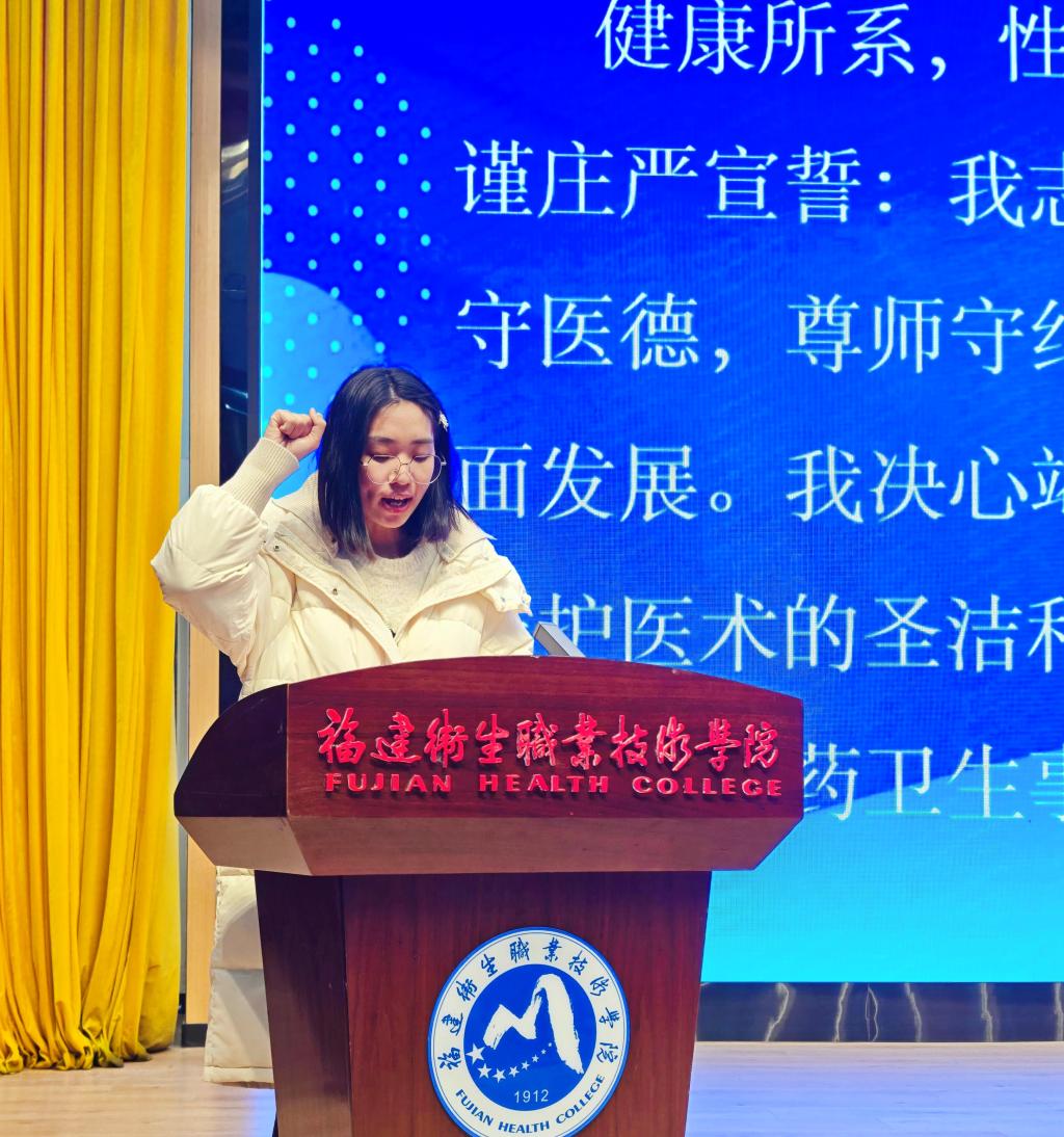 典禮上,2022級護理4班饒柳芳同學帶領(lǐng)全體畢業(yè)生重溫醫(yī)學生誓詞。拳頭緊握,誓言鏗鏘,表達了學子們不忘初心、踐行新時代醫(yī)藥衛(wèi)生職業(yè)精神的承諾。