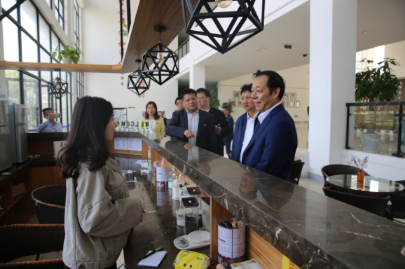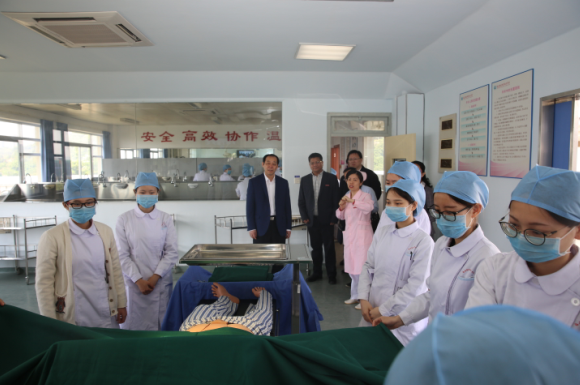 楊副省長一行先后察看了我院大學(xué)生創(chuàng)新創(chuàng)業(yè)項(xiàng)目、易班發(fā)展中心、智慧教室、護(hù)理系實(shí)訓(xùn)中心、綜合門診部(籌建中)、藥物制劑實(shí)訓(xùn)車間、明湖食堂和學(xué)生宿舍,并看望了護(hù)理專業(yè)精準(zhǔn)教育扶貧班學(xué)生。每到一處,楊副省長都詳細(xì)察看校園校貌、功能場(chǎng)室,并與師生親切交談。