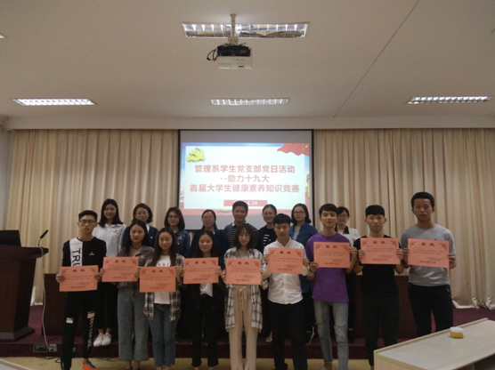 為認(rèn)真宣傳貫徹十九大會議精神,實施健康中國戰(zhàn)略,踐行全民健康素養(yǎng)促進(jìn)行動計劃,增強預(yù)備黨員和入黨積極分子踐行十九大精神的意識與決心,4月26日午,在管理系學(xué)生黨支部教師黨員的帶領(lǐng)下,“助力十九大”系列主題黨日活動之管理系首屆大學(xué)生健康素養(yǎng)知識競賽在行政樓六樓會議室火熱開展。管理系黨政負(fù)責(zé)人、管理系各黨支部書記以及學(xué)生黨支部教師黨員們參加本次活動。