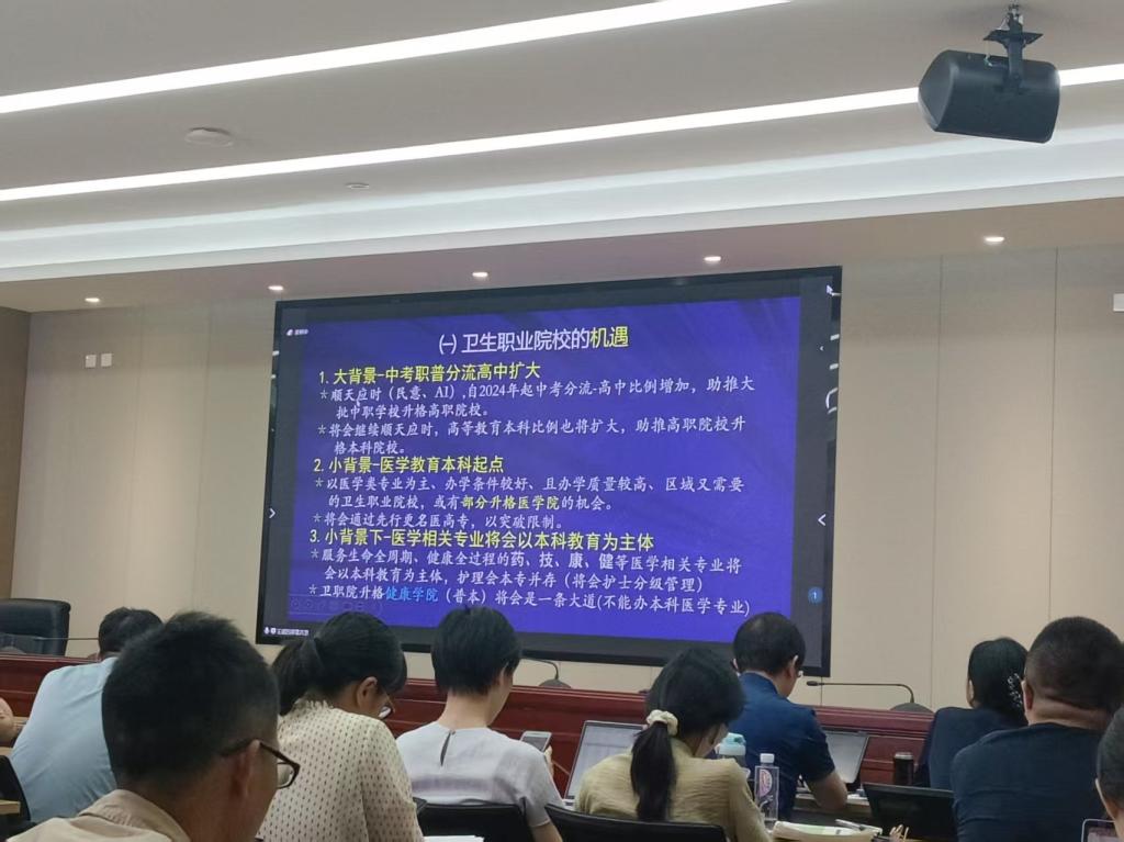 6月10日,全國衛(wèi)生健康職業(yè)教育教學指導(dǎo)委員會專家系列講座(第三期)在線上舉辦。我校在厚德樓六樓會議室設(shè)立分會場,校長徐偉,副校長周雄、朱扶蓉以及相關(guān)職能處室負責人、二級學院負責人、骨干教師等近百人參加會議。