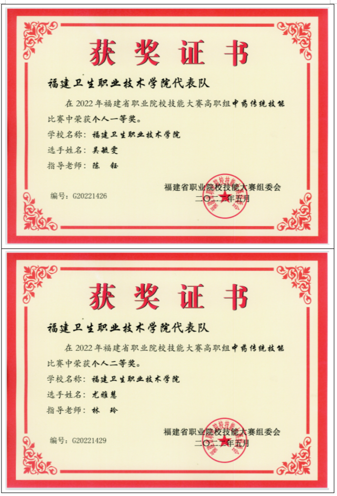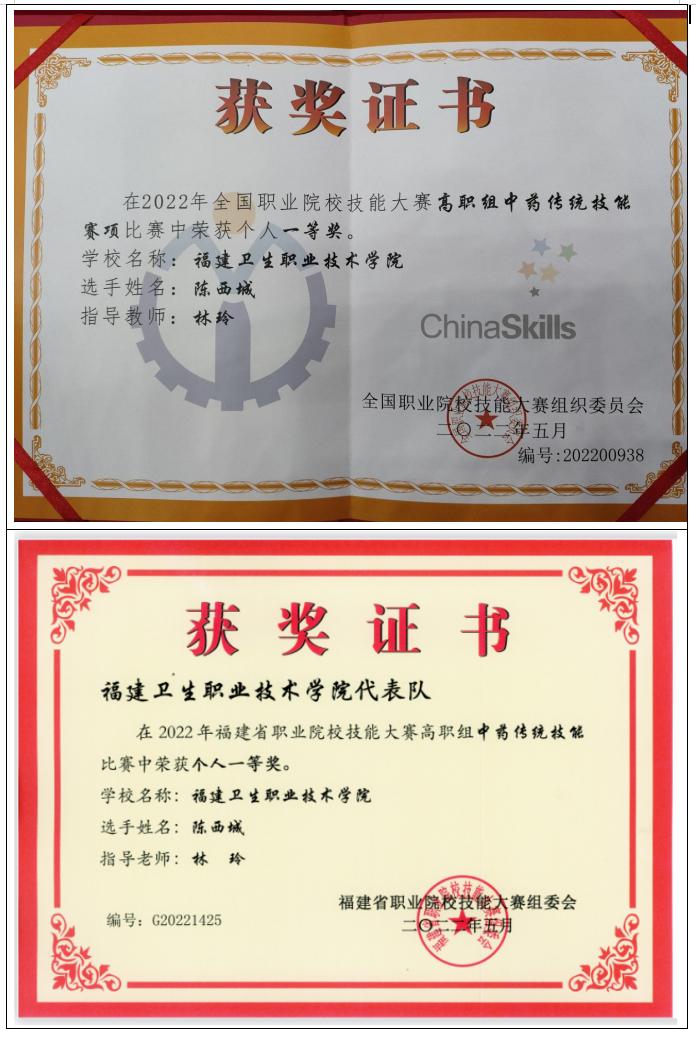中藥學子在2022年全國職業(yè)院校技能大賽高職組中藥傳統(tǒng)技能賽項比賽中榮獲個人一等獎