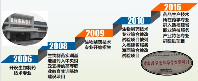 隨著《國務院關于支持福建省加快建設海峽西岸經濟區(qū)的若干意見》和《促進生物產業(yè)加快發(fā)展若干政策》等文件的頒布以及福建省出臺的《生物與新醫(yī)藥產業(yè)振興實施方案》,學校加大對藥品生產技術專業(yè)建設的投入和扶持,藥品生產技術專業(yè)快速發(fā)展。2008年生物制藥實訓基地被列入中央財政支持的高等職業(yè)教育實訓基地建設項目,2010年生物制藥技術專業(yè)綜合教改試驗項目被列入福建省服務海西綜合教改試驗項目;2011年參與了教育部高職高專生物制藥技術專業(yè)教學資源庫建設;2013年入選福建省高等職業(yè)教育生產性實訓基地;2016年藥學專業(yè)群(含藥品生產技術專業(yè))入選福建省職業(yè)院校服務產業(yè)特色專業(yè)群建設項目,2017年藥學專業(yè)群實訓基地(含藥品生產技術專業(yè))入選福建省職業(yè)院校專業(yè)群實訓基地培育項目。2021年,藥學專業(yè)群(含藥品生產技術專業(yè))入選福建省職業(yè)院校高水平專業(yè)群。