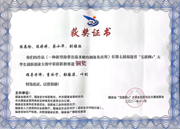 第七屆福建省“互聯網+”創(chuàng)新創(chuàng)業(yè)大賽職教賽道銅獎證書