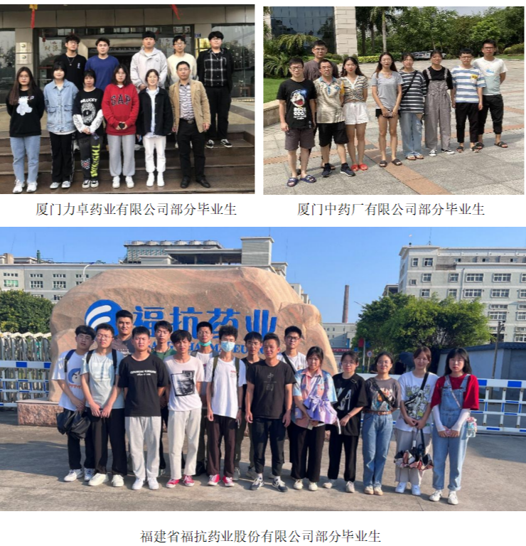 本專業(yè)畢業(yè)生主要在藥品生產企業(yè)、藥品檢測部門和生物制品企業(yè)等相關企事業(yè)單位從事藥品生產、質量檢測和技術研發(fā)等工作,培養(yǎng)質量獲得社會的廣泛認可,近三年就業(yè)率達98%以上,福建廣生堂藥業(yè)股份有限公司、福建省??顾帢I(yè)股份有限公司、廈門力卓藥業(yè)有限公司和廈門萬泰滄海生物技術有限公司等福建省知名企業(yè)均有就業(yè)。