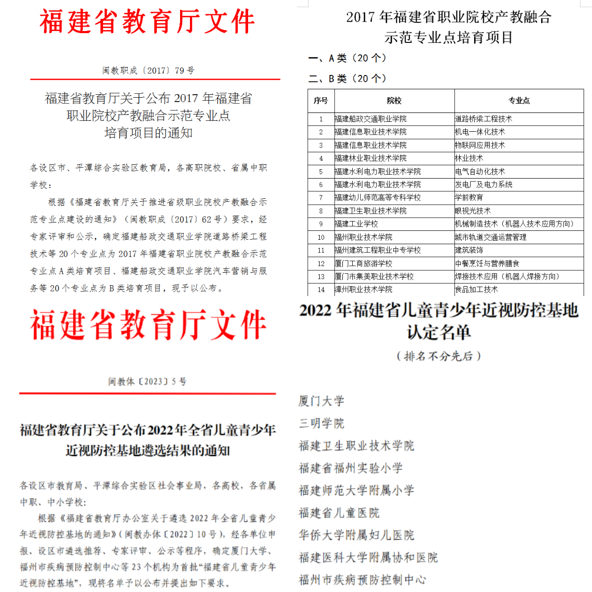 眼視光技術(shù)專業(yè)于2016年入選“福建省第二批現(xiàn)代學(xué)徒制試點項目”,2017年被評為“福建省職業(yè)院校產(chǎn)教融合示范專業(yè)點”,2021年入選福建省高水平高職專業(yè)群重點建設(shè)專業(yè),2021年獲批準(zhǔn)為眼鏡驗光員、眼鏡定配工職業(yè)技能等級培訓(xùn)和鑒定考核站點,同年面向社會開展培訓(xùn)和考核認(rèn)定工作,2023年被確定為首批福建省兒童青少年近視防控基地。