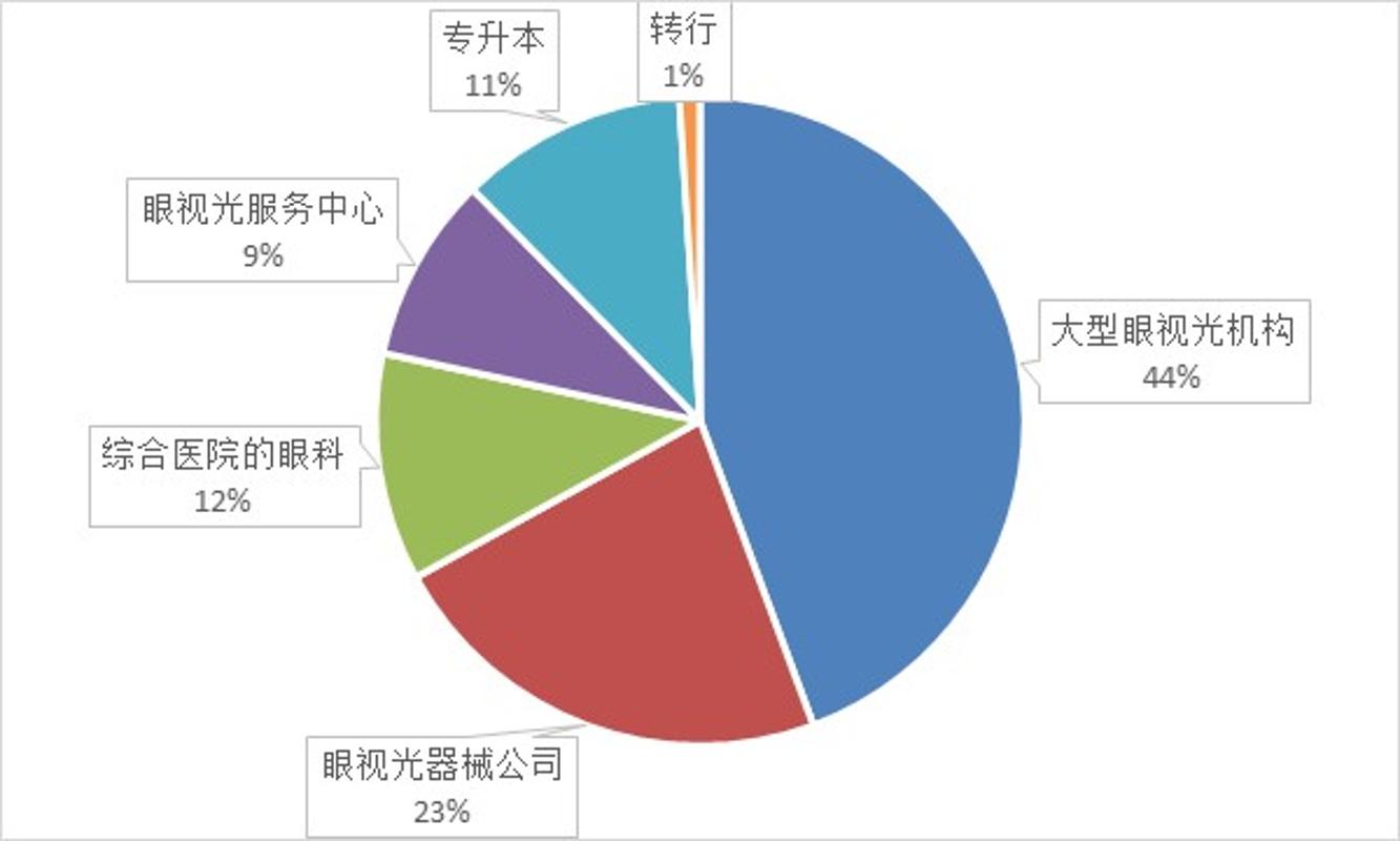 畢業(yè)生的主要去向是大型眼視光機構(gòu)的驗光崗和眼視光器械公司的技術(shù)培訓(xùn)崗,其中就業(yè)前二位的機構(gòu)是愛爾眼科醫(yī)院集團股份有限公司、華廈眼科醫(yī)院集團。