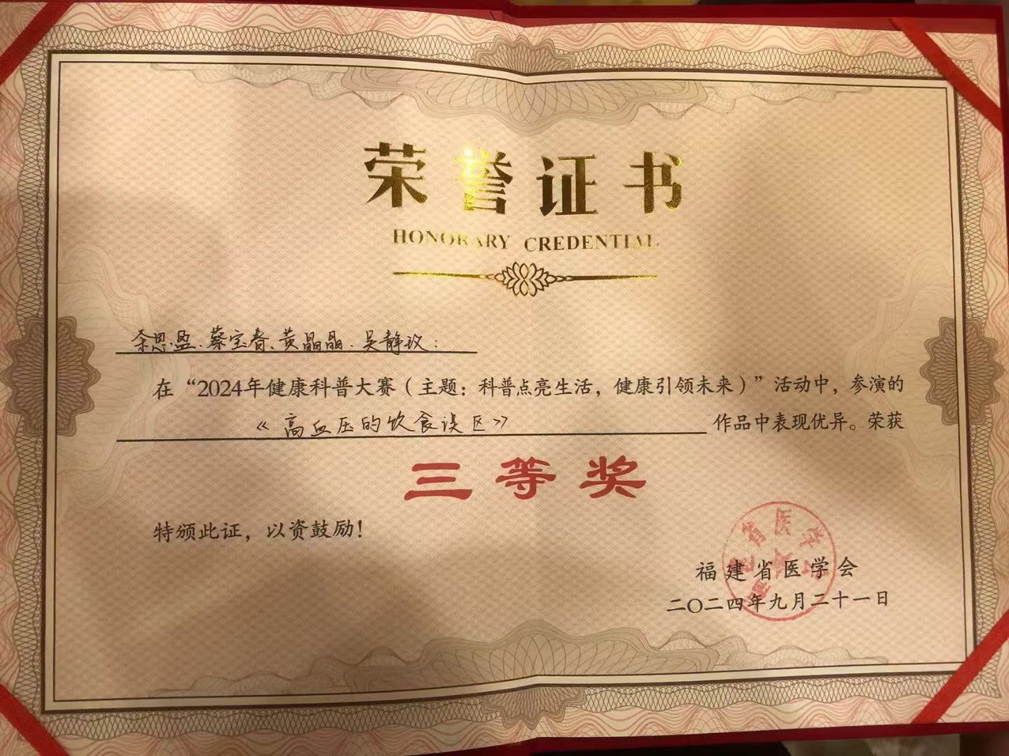 獲福建省第六屆“全民營(yíng)養(yǎng)周”系列活動(dòng)之線上科普作品大賽,特等獎(jiǎng)、一等獎(jiǎng)、二等獎(jiǎng)各1項(xiàng)  |