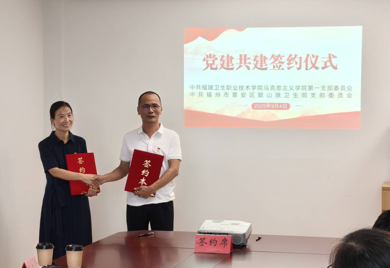 為深入貫徹落實新時代黨的建設總要求,推動基層黨組織建設提質增效,9月4日,中共福建衛(wèi)生職業(yè)技術學院馬克思主義學院第一支部委員會與中共福州市晉安區(qū)鼓山鎮(zhèn)衛(wèi)生院支部委員會舉行黨建共建簽約儀式,正式確立結對共建關系,共同打造“思想領航·健康護航”黨建共建新平臺。
