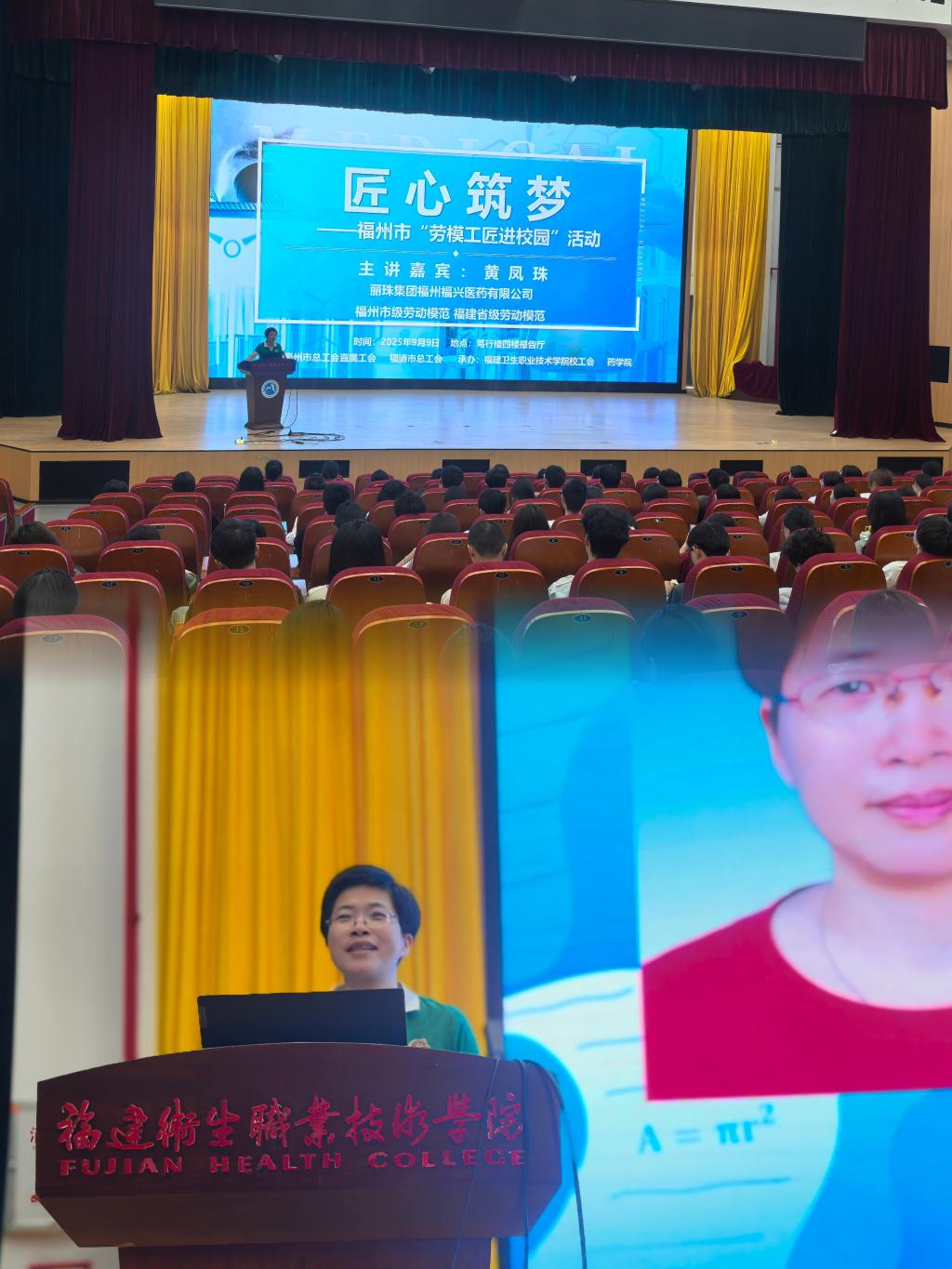“匠心筑夢(mèng)”環(huán)節(jié)將活動(dòng)推向高潮。福建省級(jí)勞動(dòng)模范、福州市勞動(dòng)模范,麗珠集團(tuán)福州福興醫(yī)藥有限公司菌種中心經(jīng)理黃鳳珠走進(jìn)校園,分享她從一線技術(shù)員到行業(yè)標(biāo)桿的成長(zhǎng)歷程。她以樸實(shí)而有力的語言詮釋了“工匠精神”——不是遙遠(yuǎn)的口號(hào),而是每一天的堅(jiān)守與熱愛。同學(xué)們?cè)谒砩峡吹搅怂帉W(xué)人應(yīng)有的擔(dān)當(dāng)與追求。