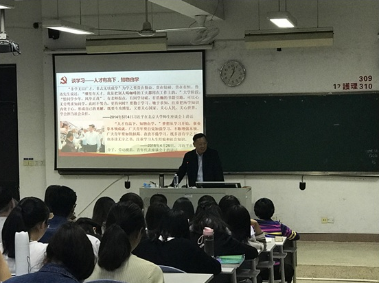 4月10日,我院黨委曾武祈書記走進思政課堂,為護理系學生講授以“征程新時代 召喚新青年 勇?lián)率姑睘橹黝}的形勢政策課。