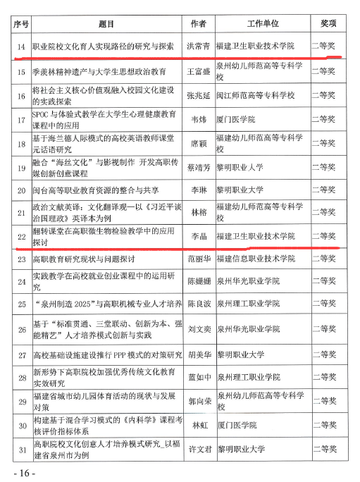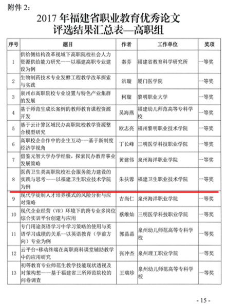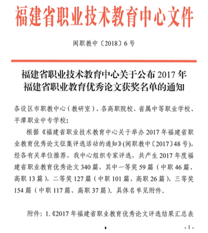 根據(jù)《福建省職業(yè)技術(shù)教育中心關(guān)于公布2017年福建省職業(yè)教育優(yōu)秀論文獲獎(jiǎng)名單的通知》(閩職教中〔2018〕6號(hào))文件通知,我院朱扶蓉老師的論文《醫(yī)藥衛(wèi)生類高職院校社會(huì)服務(wù)能力建設(shè)的實(shí)踐與思考》喜獲2017年福建省職業(yè)教育優(yōu)秀論文評(píng)選高職組一等獎(jiǎng),洪常青老師的論文《職業(yè)院校文化育人實(shí)現(xiàn)路徑的研究與探索》及李晶老師的《翻轉(zhuǎn)課堂在高職微生物檢驗(yàn)教學(xué)中的應(yīng)用探討》喜獲2017年福建省職業(yè)教育優(yōu)秀論文評(píng)選高職組二等獎(jiǎng)。