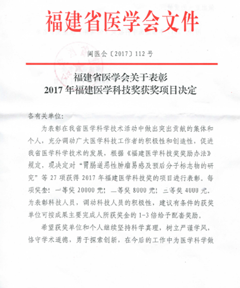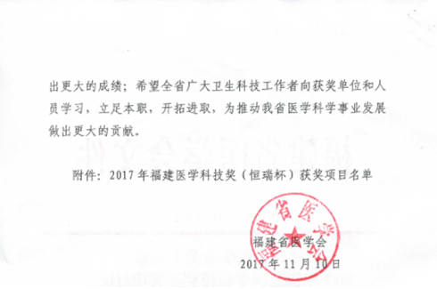 根據(jù)《福建省醫(yī)學(xué)會關(guān)于表彰福建醫(yī)學(xué)科技獎獲獎項目的決定》(閩醫(yī)會〔2017〕112號)文件通知,我院黃仁杰、肖健等老師為主要完成人的“伏立諾他原料及其膠囊劑的開發(fā)”項目喜獲2017年福建省醫(yī)學(xué)科技獎三等獎。