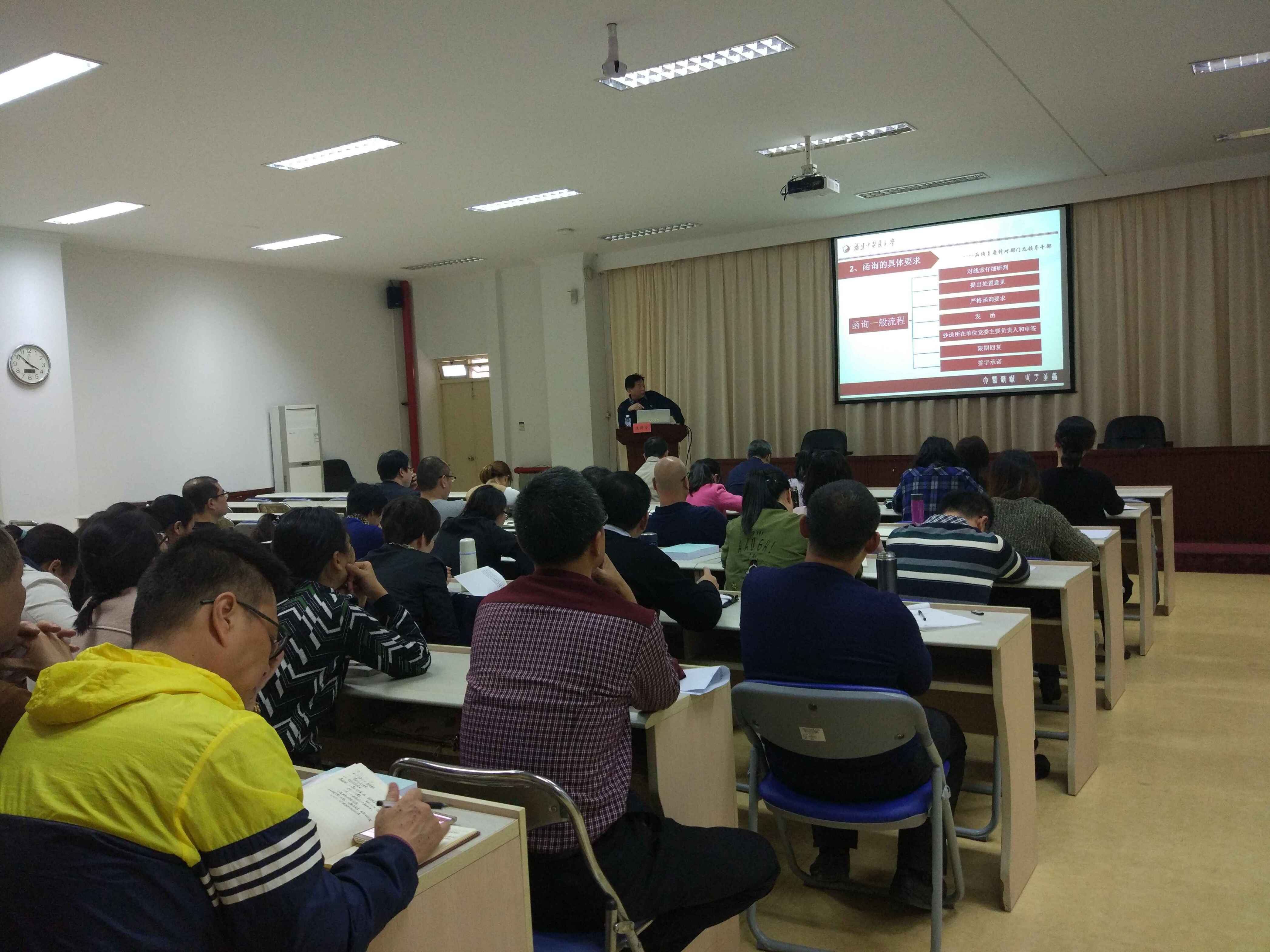 沐得力書記的培訓(xùn)講座圍繞監(jiān)督執(zhí)紀(jì)工作的沿革、監(jiān)督執(zhí)紀(jì)工作的主要內(nèi)容和新時(shí)期做好監(jiān)督執(zhí)紀(jì)工作需要注意的問題為主要內(nèi)容展開,結(jié)合學(xué)習(xí)十九大精神與貫徹執(zhí)行《中國共產(chǎn)黨紀(jì)律檢查機(jī)關(guān)監(jiān)督執(zhí)紀(jì)工作規(guī)則(試行)》,闡述了十八大以來黨風(fēng)廉政建設(shè)和反腐敗工作取得的成效、紀(jì)檢監(jiān)察部門職能轉(zhuǎn)變以及監(jiān)督執(zhí)紀(jì)“四種形態(tài)”的把握和運(yùn)用,詳細(xì)地介紹了信訪處理、問題線索管理、執(zhí)紀(jì)審查等方面的業(yè)務(wù)辦理工作。最后,沐書記結(jié)合自己多年來對高校紀(jì)檢監(jiān)察工作的理論研究和經(jīng)驗(yàn)實(shí)踐,強(qiáng)調(diào)了高校監(jiān)督執(zhí)紀(jì)工作應(yīng)注意把握好四個(gè)方面的關(guān)系。