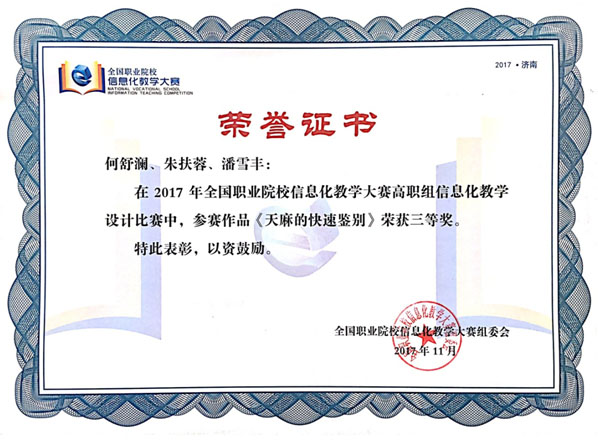我院藥學(xué)系何舒瀾、朱扶蓉、潘雪豐等三位教師的參賽作品《天麻的快速鑒別》經(jīng)過院賽、省賽、省選拔賽、國(guó)賽網(wǎng)絡(luò)評(píng)審等層層選拔,最終進(jìn)入決賽,并憑借先進(jìn)的教學(xué)理念、精巧的教學(xué)設(shè)計(jì)、精湛的授課能力榮獲高職組信息化教學(xué)設(shè)計(jì)大賽三等獎(jiǎng)。