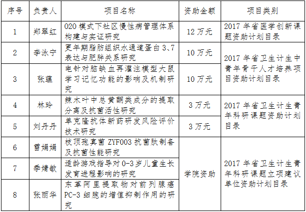 根據(jù)《福建省衛(wèi)生計生委關(guān)于下達2017年省衛(wèi)生計生科研人才培養(yǎng)項目資助計劃的通知》文件,我院共8個項目列入省衛(wèi)計委2017年省衛(wèi)生計生科研人才培養(yǎng)項目計劃。