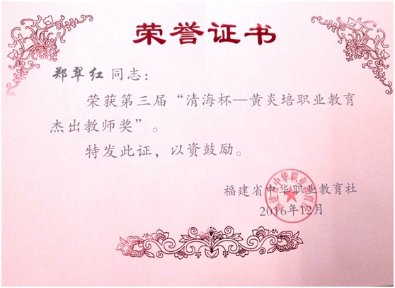 近日,福建省中華職業(yè)教育社公布了《關(guān)于表彰第三屆“清海杯—黃炎培職業(yè)教育獎(jiǎng)”獲獎(jiǎng)單位和個(gè)人的決定》(閩職社〔2016〕55號(hào)),我院護(hù)理系鄭翠紅教授榮獲第三屆“清海杯-黃炎培職業(yè)教育獎(jiǎng)”杰出教師獎(jiǎng)。