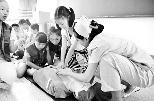 在壓軸的心肺復(fù)蘇教學(xué)環(huán)節(jié),小記者們在王老師的講解和指導(dǎo)下,開始有模有樣地進行練習(xí)。