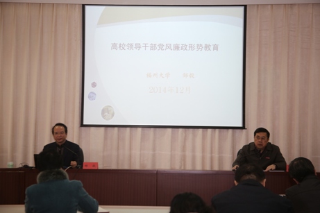 為貫徹落實黨的十八屆四中全會精神,加強學院黨風廉政建設和反腐敗工作,推進依法治校治教, 12月16日,應學院邀請,福州大學黨委常委、紀委書記鄒毅來我院作題為《深入學習貫徹十八屆四中全會精神——高校領導干部廉政形勢教育》的專題講座。講座由學院黨委書記林春明主持。學院領導、中層及以上管理干部、副高及以上專業(yè)技術人員和全體行政人員共130多人聆聽了講座。