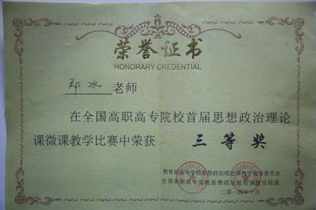 教育部高等學(xué)校思想政治理論課教學(xué)指導(dǎo)委員會、全國高職高專院校思想政治理論課建設(shè)聯(lián)盟于2014年6月20日-10月10日聯(lián)合主辦了首屆全國高職高專思想政治理論課微課教學(xué)比賽,經(jīng)激烈角逐,我院選送的鄭冰老師《形勢與政策》微課榮獲三等獎。(思政教研部)